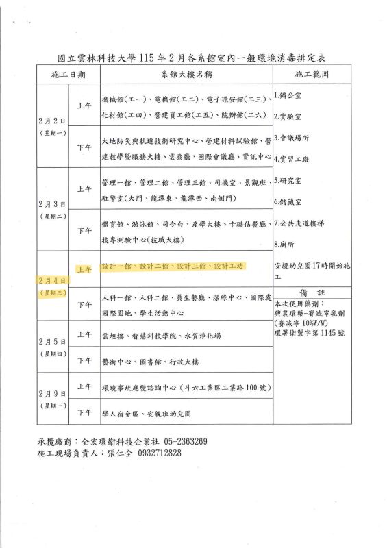 II. To maintain consistency and effectiveness of the operation, this operation will be carried out in zones. The operation time and scope are detailed in the attachment. Please cooperate with the schedule to facilitate disinfection. III. This operation will be undertaken by Quan Hong Environmental Sanitation Technology Co., Ltd. For related work inquiries, please contact the Environmental Safety Technology Center (extension 2830 within the campus).